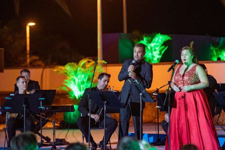 ‘Maspalomas y tú’ junto a ‘Sombras del Nublo’ fueron así las canciones más emblemáticas con las que Pedro Manuel Afonso y Judith Pessoa, junto al timplista Germán López y músicos de la Orquesta Filarmónica de Gran Canaria, deleitaron a los asistentes.