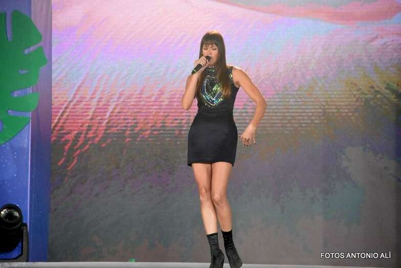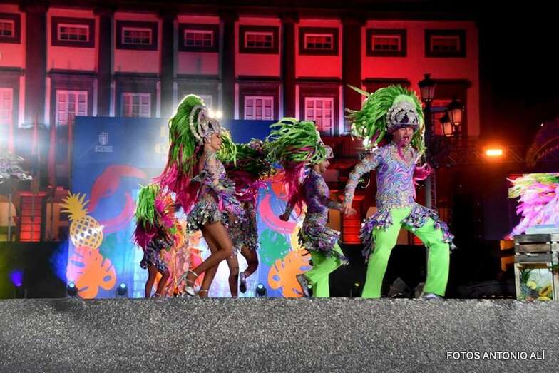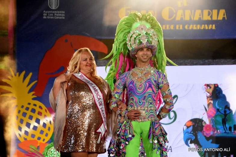 Adela Corujo Concepción, con el diseño Niteroi de Manuel Encinoso y Begoña Pérez representado al Centro Comercial Atlántico Vecindario será la última en salir a desfilar por el escenario tropical y de espíritu carioca ideado por el escenógrafo Carlos Santos.
