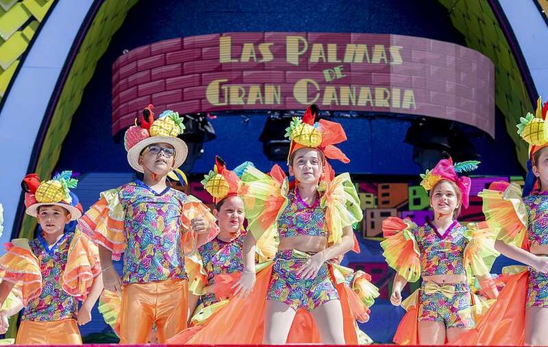 Sobre el escenario dedicado al Carnaval carioca, y según iban siendo convocados por el presentador Rafa del Pino, desfilaron aves y flores exóticas, mariposas, frutas y, además, rumberos y rumberas, pequeños que parecían llegar de escuelas de samba, tanto por sus disfraces como por las batucadas y ritmos que marcaron sus pasos. Enfrente, el público brindó una estampa salpicada de sombreros y paraguas, complementos que procuraron sombra en una mañana especialmente cálida y soleada.
