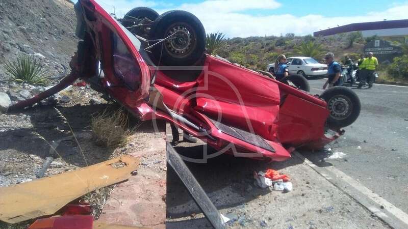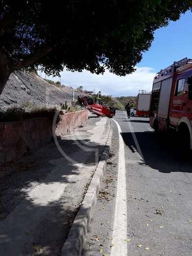 Telde.- Un vehículo ha caído este lunes por una ladera de más de diez metros y ha acabado completamente destrozado y bocabajo en la carretera de acceso al Matadero Insular, en Mercalaspalmas.