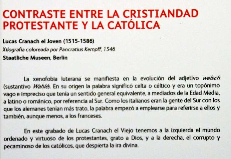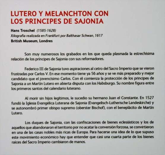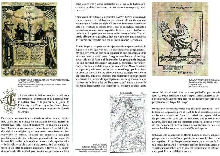 Una importante e interesantísima exposición que en su quinto centenario nos traslada al contexto político, cultural, religioso y social de la Europa del siglo XV y XVI, y el gran protagonismo del teólogo y fraile católico agustino, Martín Lutero (Eisleben, Alemania, 1483-1546) impulsor de la reforma religiosa en Alemania, originando la reforma protestante y la doctrina teológica del luteranismo. Profesor de teología en la Universidad de Wittenberg, el 31 de octubre de 1517 clava sus 95 tesis en la puerta de la iglesia del palacio de Wittenberg. Textos que condenan la situación y conducta de la iglesia en la época como prácticas de los abusos de avaricia y paganismo, indignado por la venta de indulgencias y por el espectáculo vergonzoso que ofrece la iglesia, de esta forma desafía al Papa y a Roma.