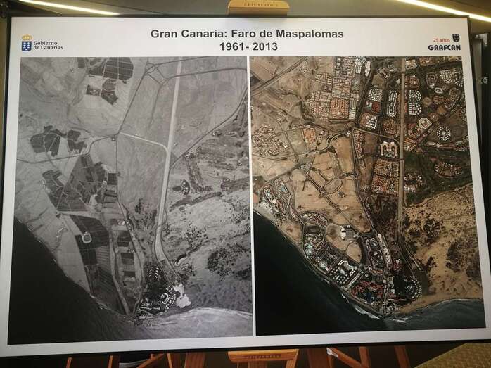 Esta exposición incluye también tres paneles con los cambios que ha habido en el entorno de las Dunas de Maspalomas, con una comparativa de una imagen aérea de 1977 en la que puede apreciarse aún en la arena el hotel de las dunas, ya demolido, con otra panorámica de 2013, además de fotografías del Faro de Maspalomas entre 1961 y 2013 y la diferencia del Estadio insular en la capital grancanaria entre 1966 y 2013.
