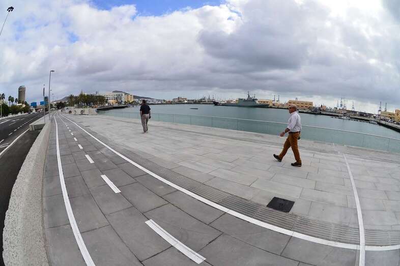 El Consistorio ha procedido a abrir un recorrido de 200 metros de paseo peatonal que incluye un carril bici, que discurre paralelo a la Avenida Marítima, situado entre la Base Naval y el entorno del Muelle de Santa Catalina, mientras continúan los trabajos en la sección situada junto al voladizo sobre el mar hasta completar la obra de forma definitiva.