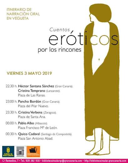 Desde que el Cabildo grancanario, a través de su Biblioteca Insular, puso en marcha este circuito de cuentos eróticos por los rincones de Vegueta hace doce años, el éxito de público no ha cesado de crecer. El año pasado casi un millar de personas participaron en esta singular propuesta que se dota de una modesta infraestructura escénica (apenas un foco de luz y un micro para que los narradores puedan amplificar sus palabras), con la que es posible vivir y disfrutar también el casco histórico de la ciudad de otra manera. Cuentistas y cuentos, en definitiva, para todos los gustos y libidos; cuentos, en definitiva, para cada experiencia interior y la manera particular que cada uno y una tiene de conjugar el deseo.