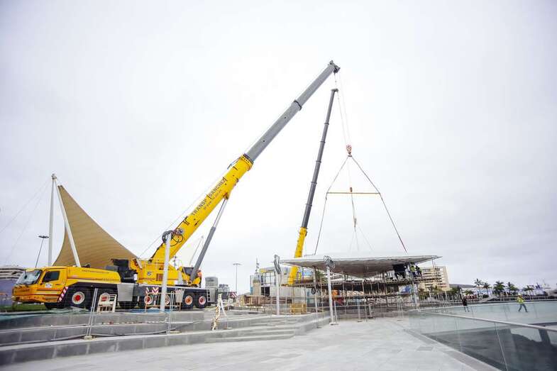 Dos grúas móviles han instalado una de las pérgolas, de 14 toneladas y 300 metros cuadrados de superficie, con la que se "pretende mejorar todo el entorno del Muelle Santa Catalina, que sirve de puerta de entrada y salida" a los cruceros que llegan a la capital grancanaria, ha informado este viernes el Consistorio en un comunicado.
