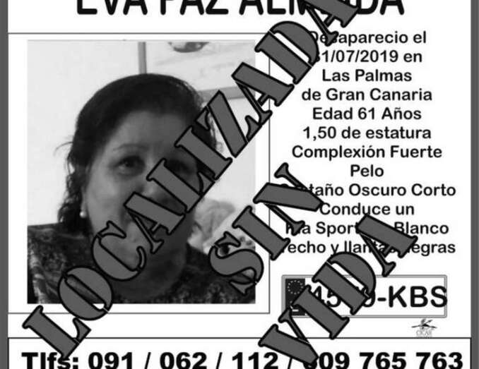 Según informa en su edición digital el diario Canarias7, El Grupo de Intervención Operativo de Rescate y Salvamento (GIORS) Canarias ha confirmado que se ha encontrado el cuerpo sin vida de Eva Paz, de 62 años. La mujer desapareció este miércoles 31 de julio en la capital grancanaria.