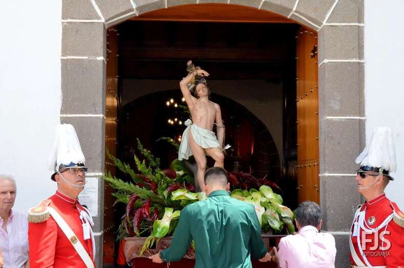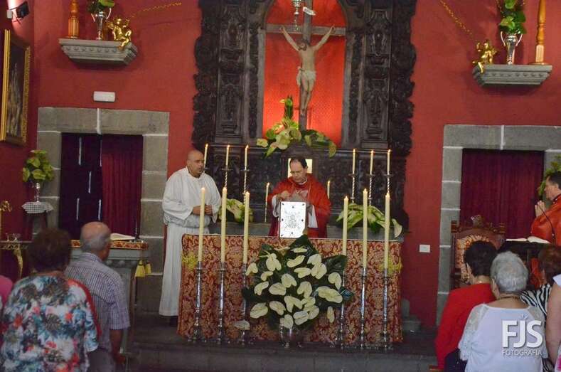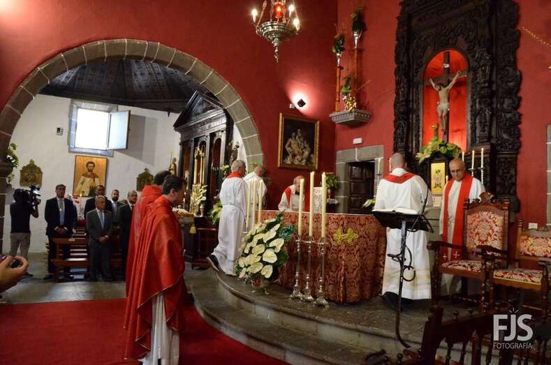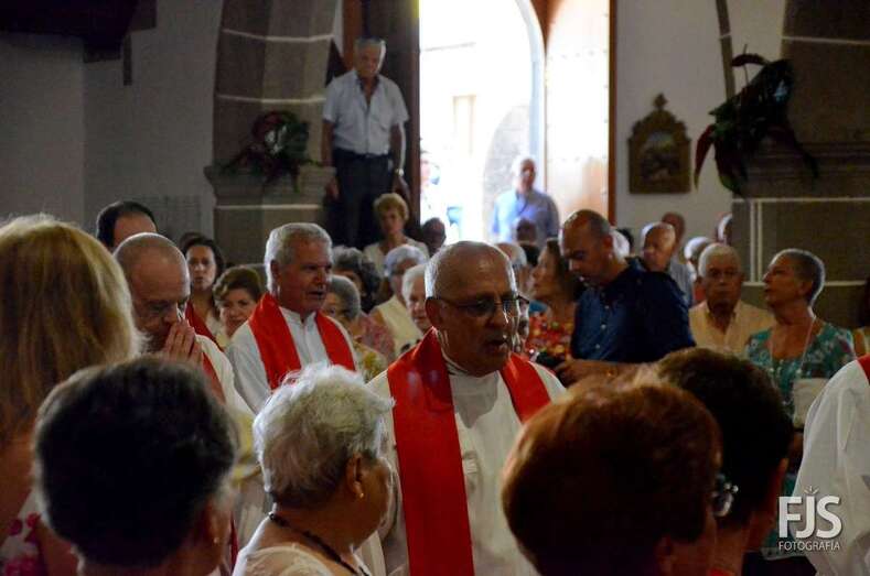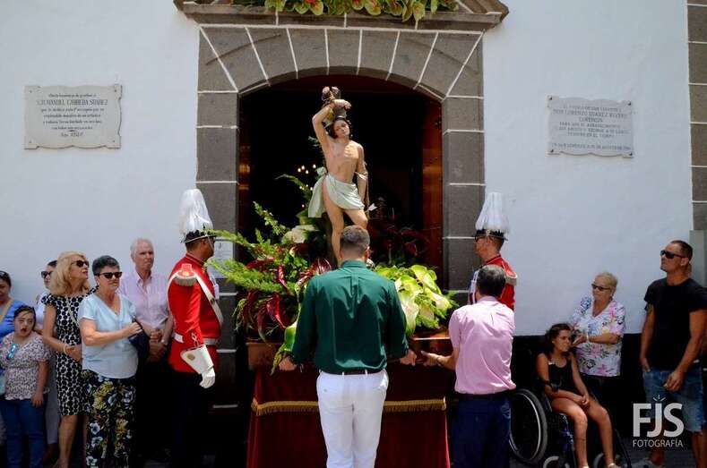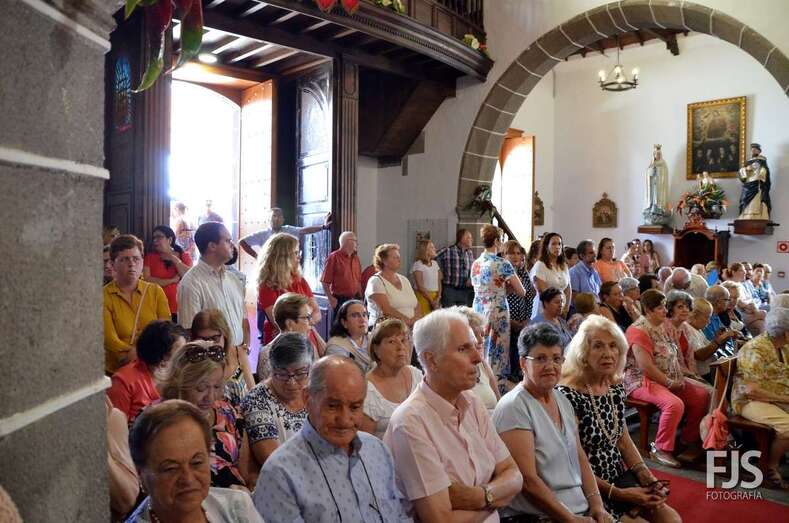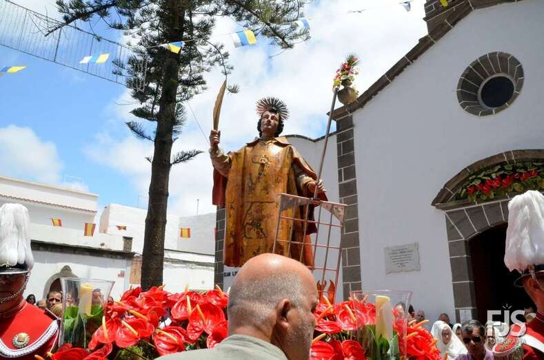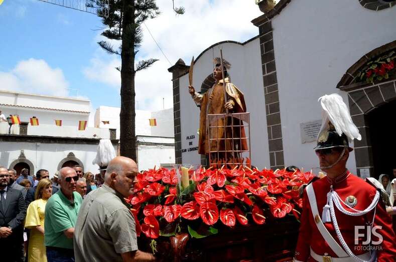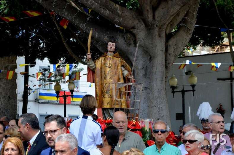 Una vez terminada la eucaristía oficiada por Joaquín Belón, que estuvo acompañado por varios sacerdotes de diferentes parroquias de la Diócesis de Canarias, el trono de San Lorenzo asomaba al pórtico de la iglesia matriz al filo de las 14.00 horas, donde fue recibido por lanzamiento de voladores y repiques de campanas, al que se unió el copatrono San Sebastián y la copatrona Ntra. Sra. del Buen Suceso.