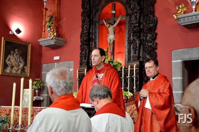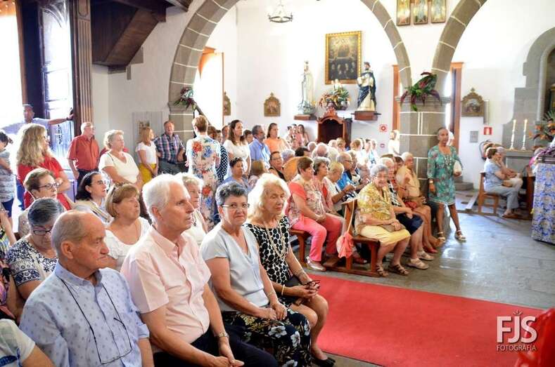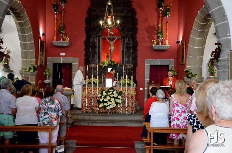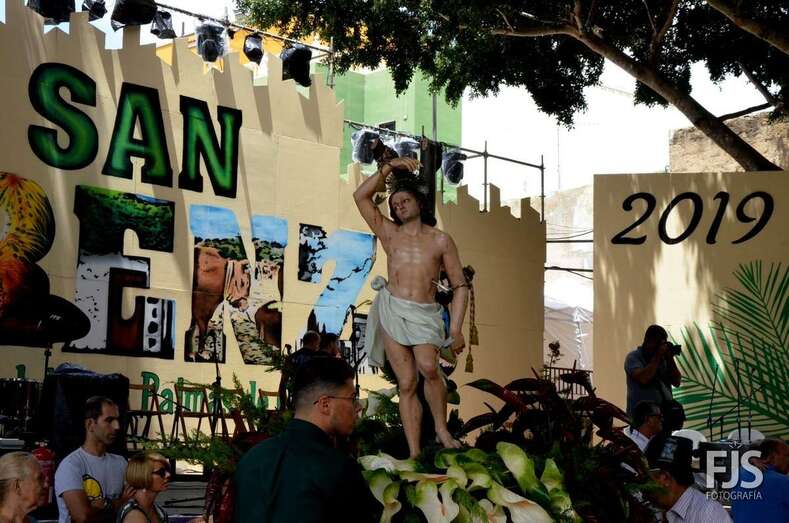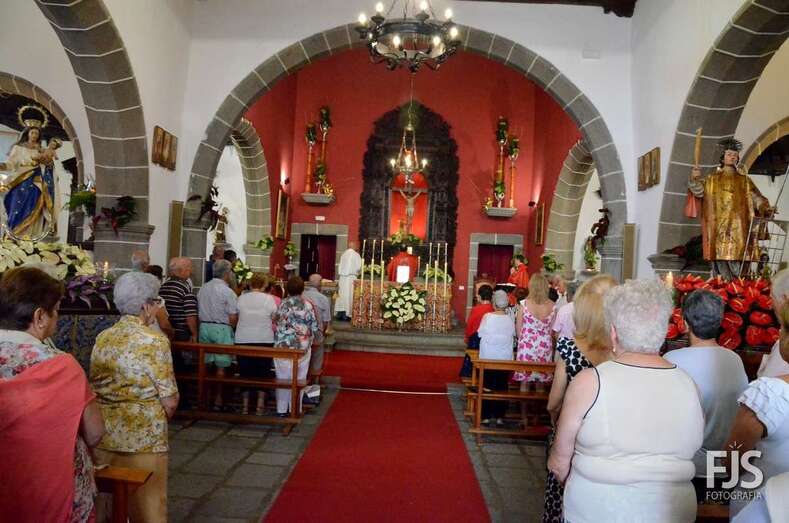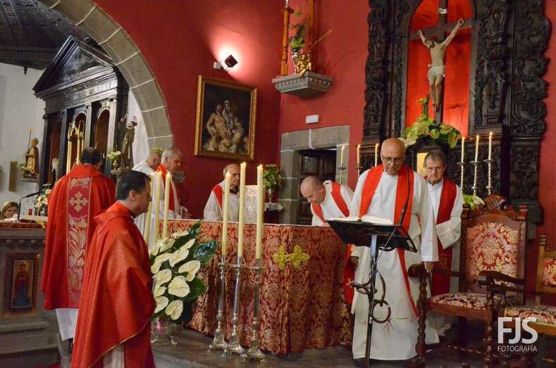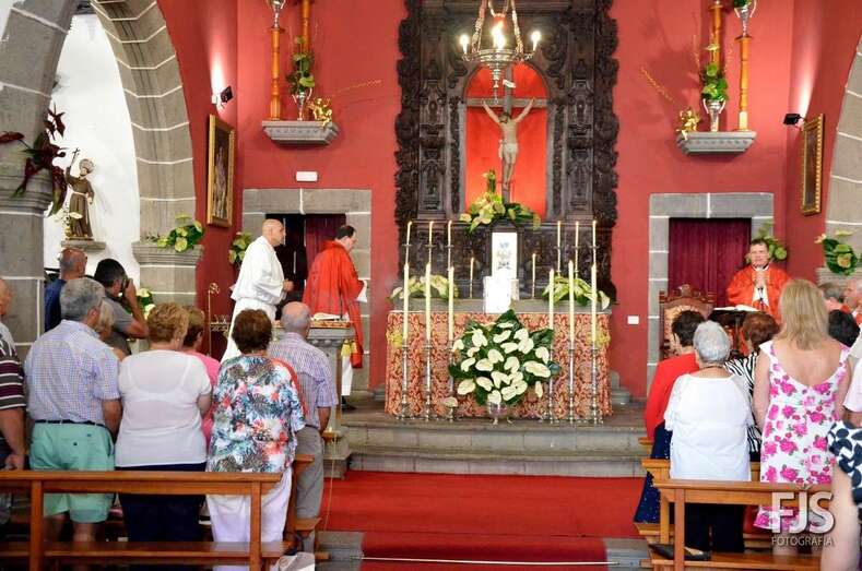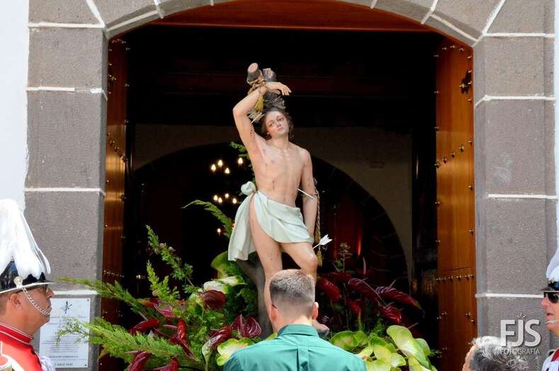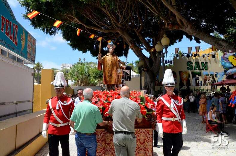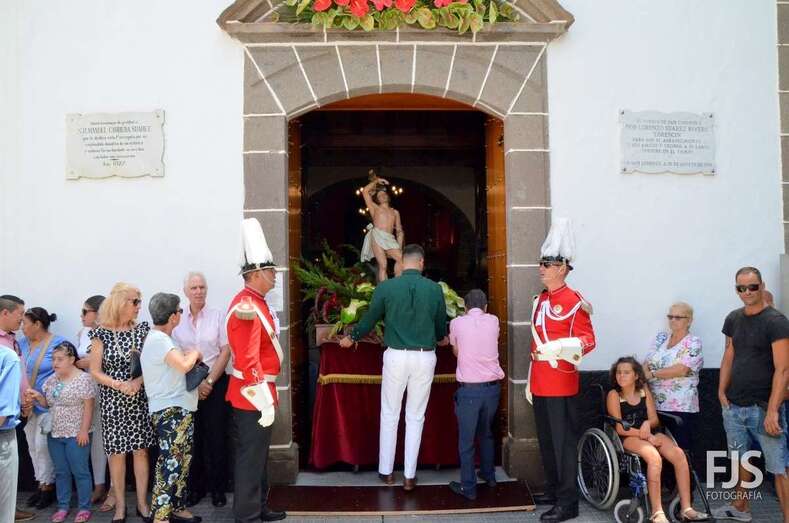 Una vez terminada la eucaristía oficiada por Joaquín Belón, que estuvo acompañado por varios sacerdotes de diferentes parroquias de la Diócesis de Canarias, el trono de San Lorenzo asomaba al pórtico de la iglesia matriz al filo de las 14.00 horas, donde fue recibido por lanzamiento de voladores y repiques de campanas, al que se unió el copatrono San Sebastián y la copatrona Ntra. Sra. del Buen Suceso.