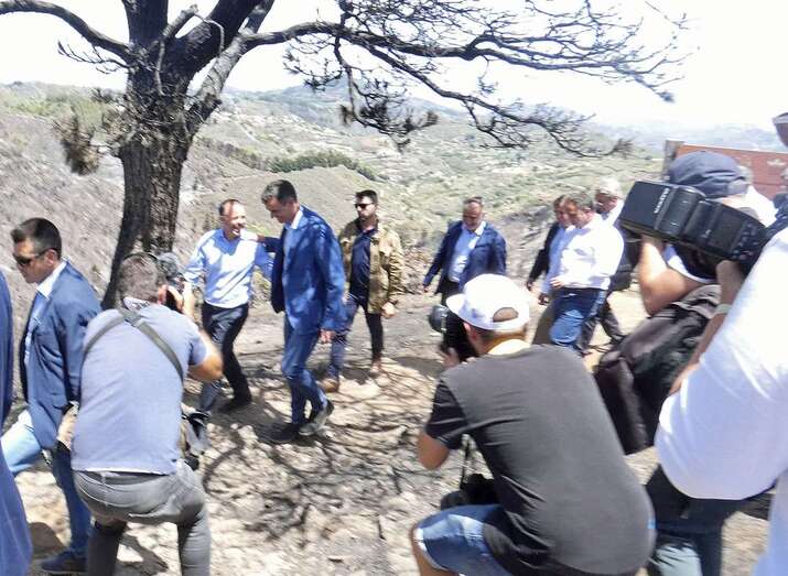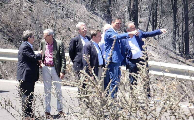 Sánchez, Torres, el presidente del Cabildo de Gran Canaria, Antonio Morales, y varios alcaldes han caminado también por los alrededores de Cuevillas y de Aríñez, dos de las zonas más afectadas por el fuego, en un recorrido que ha completado la imagen que el presidente traía del su sobrevuelo en helicóptero, porque allí la tierra aún humea y todo, todo, huele con intensidad a quemado.