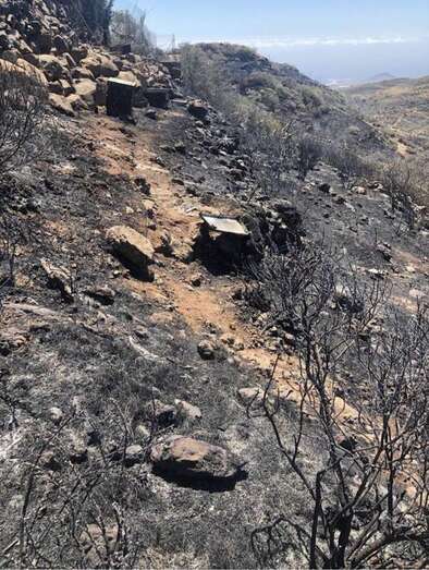 Araceli Perera divisaba desde su terreno cómo "tres helicópteros trabajaban apagando focos y refrescando la zona y, aun así, se reavivó". Luego, "cuando pilló las cañas en el barranco, prendió con velocidad". "Cuando vi el fuego, casi me muero", reconoce, porque estaba quemándose la única zona que se había salvado en el primer incendio", el de la semana anterior.