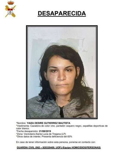 La mujer, de nombre Yaiza Desiré Gutiérrez Bautista, vestía la última vez que fue vista una cazadora de color vino, pantalón vaquero negro y zapatillas deportivas blancas.