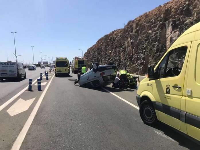 Telde.- Tres personas han resultado heridas, una de ellas de gravedad, por el vuelco de un vehículo, un siniestro que ha tenido lugar este sábado en la GC-1, en el acceso al Cruce de Arinaga, según ha informado el 112.