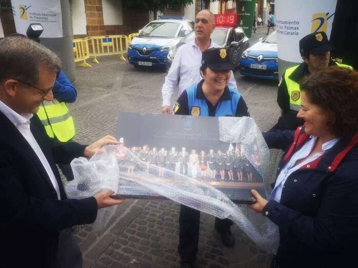 Asimismo, en la finalización de la prueba, el Comisario Carlos Saavedra Brichis hizo entrega a Eulalia Guerra de un recuerdo conmemorativo por su trabajo y colaboración con el cuerpo armado, en este caso una instantánea enmarcada de la primera promoción de mujeres de la Policía Local