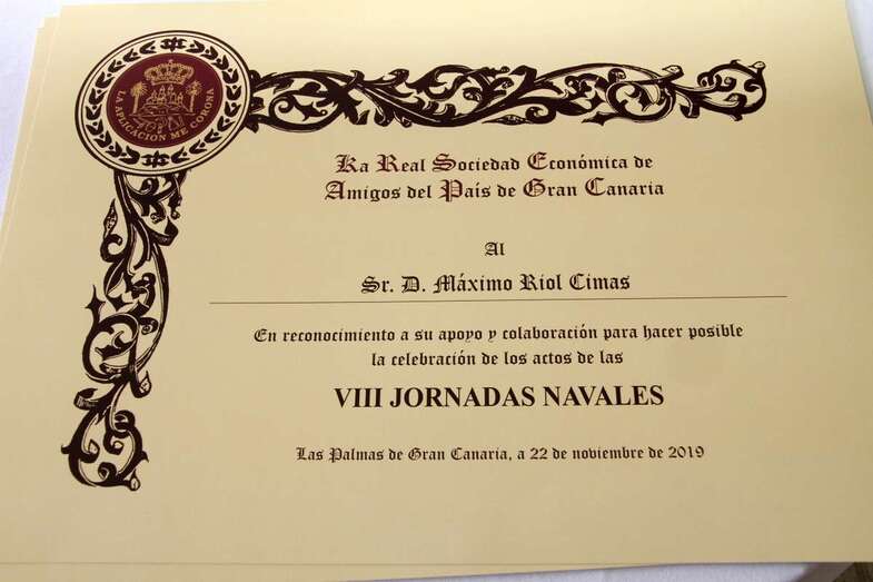 Al autor de la escultura monumento inaugurado el martes 12 de noviembre, escultor Máximo Riol Cimas, quien recibe el Diploma de manos del director de la Real Sociedad Económica, don Tomás Van de Walle Sotomayor. Otra empresa que tradicionalmente apoyan las Jornadas decididamente, es Repnaval Zamakona, Diploma que entrega don Luis Ibarra a don Roberto Reyes Alzola. Capitán de Navío don José Ramón Vallespín que impartió la conferencia de inauguración. A todos las personalidades, instituciones y empresas ausentes en este acto se le hará llegar sus diplomas acreditativos.