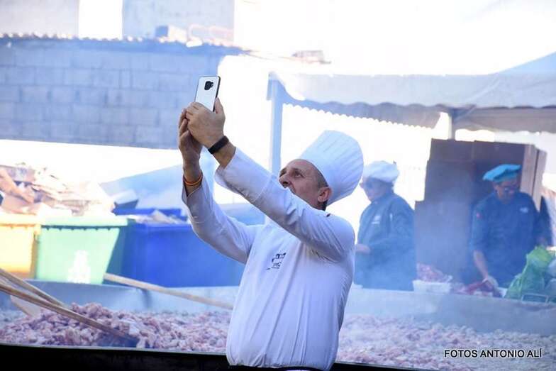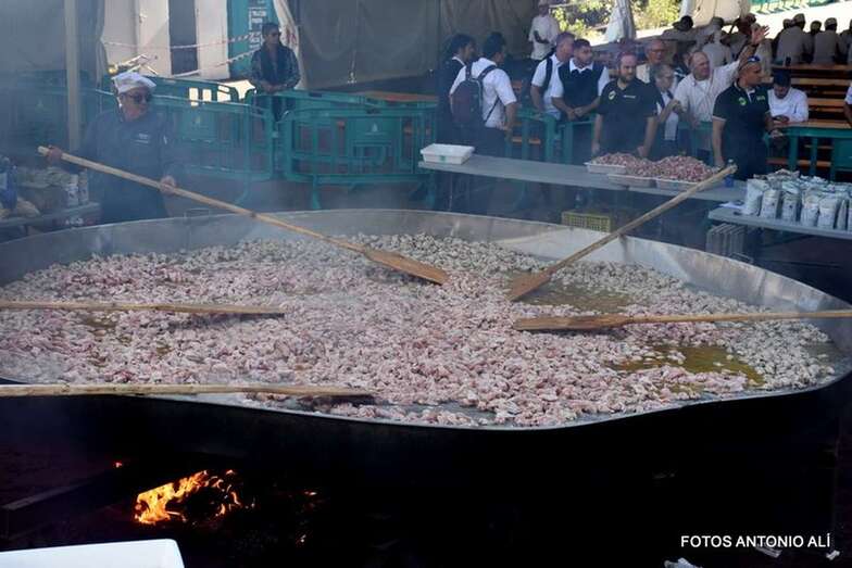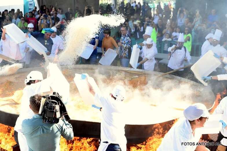 Con el fuego avivado con ocho sacos de carbón y tres metros cúbicos de leña de almendro y encina, fueron añadiendo los ingredientes: dos mil litros de agua, 130 litros de aceite de oliva virgen, otros 300 litros de caldo concentrado, 700 kilos de jamoncitos de pollo, 300 kilos de cerdo, 550 kilos de verdura, 100 kilos de tomates, 27 kilos de sal, cerca de 3 kilos de pimentón y 35 kilos de sofrito, cocidos con esmero y atención durante cinco horas. Hasta que, por fin, en un ejercicio de coordinación y sincronización milimétrica, entre todos los presentes ante la paellera, de cinco metros de diámetro y treinta centímetros de grosor, lanzaron al simultáneamente los 630 kilogramos de arroz bomba en un tiempo calculado para lograr el punto perfecto del arroz.