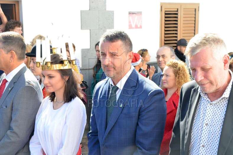 En la puerta de la iglesia se celebró el tradicional ritual en el que la Lucía sueca y la canaria reciben sendos gánigos con leche y agua que desparraman en el suelo en el inicio de la ofrenda a la patrona del pueblo. Niños y niñas con la vestimenta popular canaria también acercaron productos de la tierra como ofrenda a Santa Lucía.