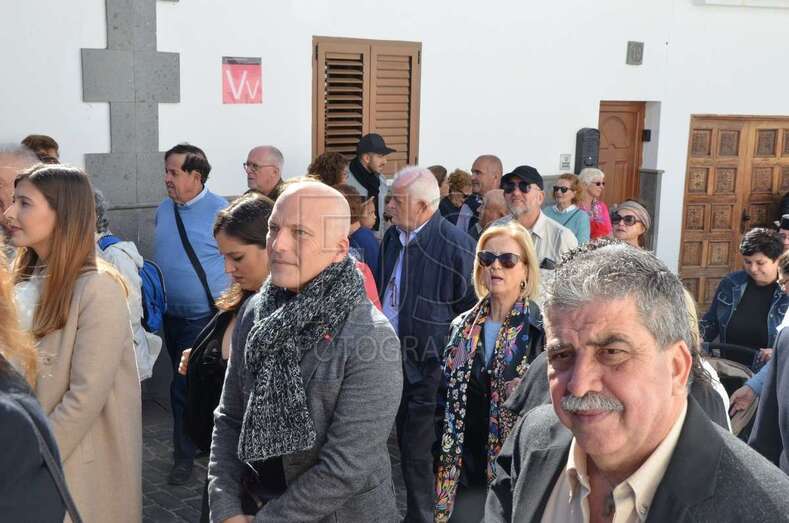 Desde las ocho y media de la mañana el pueblo olía a aceitunas y pan de leña que llenaban los numerosos puestos abiertos en los aparcamientos junto a las Consistoriales y alrededor de la plaza de la iglesia. Guaguas con turistas, santaluceños y peregrinos llegados del resto del municipio fueron llenando la plaza.