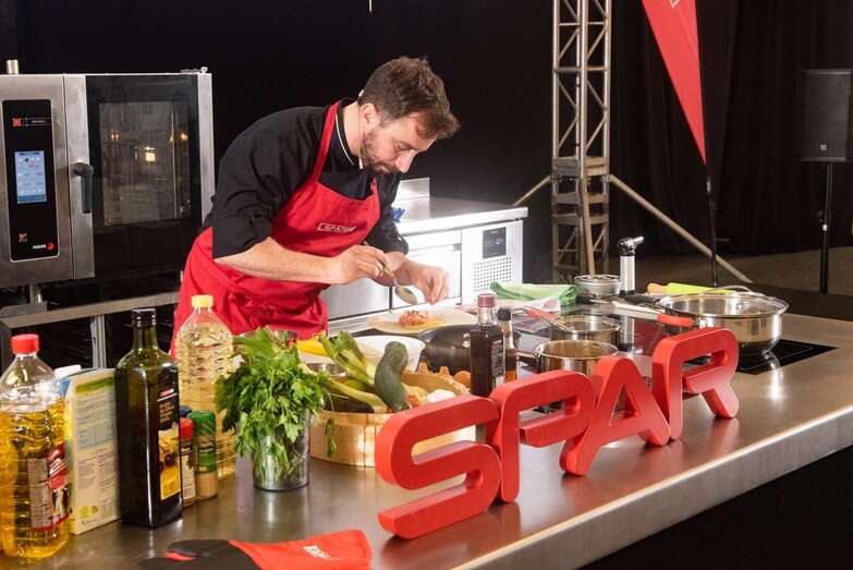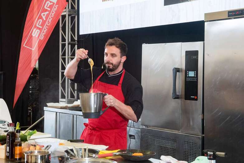El chef y asesor gastronómico Lolo Román, una de las estrellas de la restauración insular presentes en la Feria Gran Canaria Me Gusta, ofreció una exhibición de cocina en vivo que fundamentó en la verdura y la fruta de la isla con un entrante de tomate sobre gazpacho de aguacate, un canelón vegetal con salsa de curry y un polvito uruguayo de queso ahumado, tres deliciosas pruebas, como dijo, “de que se puede cocinar sano y sabroso”.