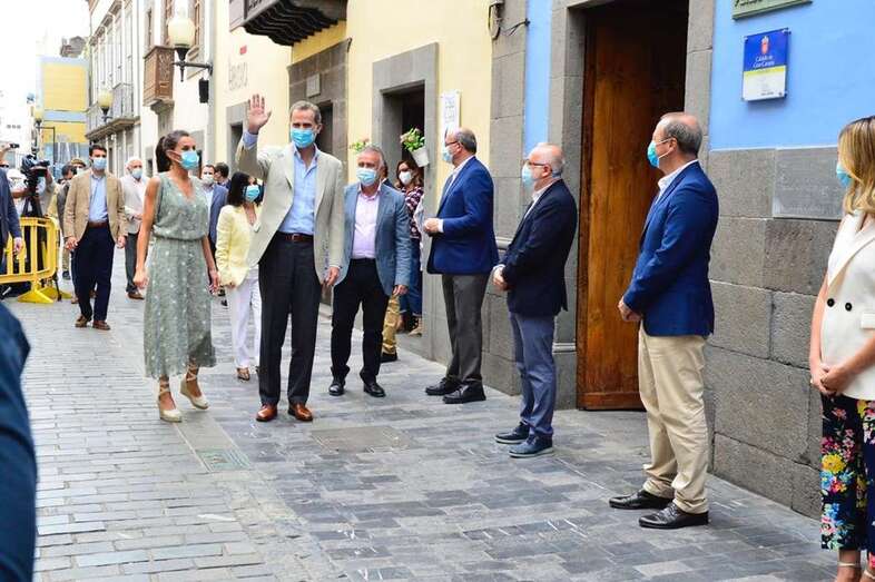 Los reyes llegaron a la calle Cano, donde se encuentra la casa de Galdós, a las 11.45 horas, acompañados por el presidente de Canarias, Ángel Víctor Torres; el presidente del Cabildo de Gran Canaria, Antonio Morales; y el alcalde de la capital, Augusto Hidalgo.