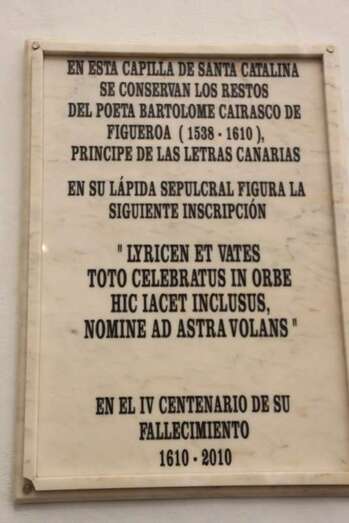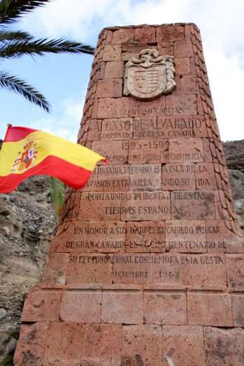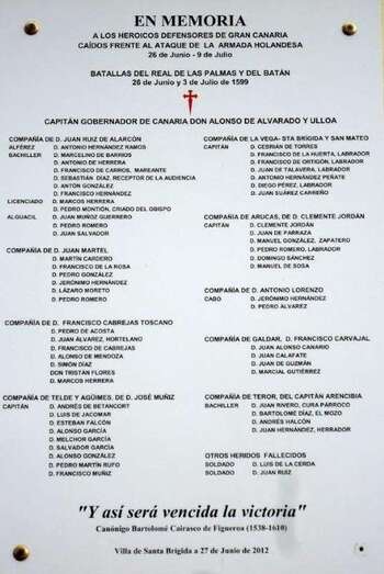 “Al Glorioso Capitán Alonso de Alvarado Gobernador de Gran Canaria 1595-1599 que al frente del pueblo hecho milicia voluntaria defendió esta isla de la invasión extranjera dando su vida por la unidad y libertad de estas tierras españolas. En Honor a sus héroes el Cabildo Insular de Gran Canaria en el Cincuentenario de su Ley Fundacional Conmemora esta gesta. Diciembre 1962”.