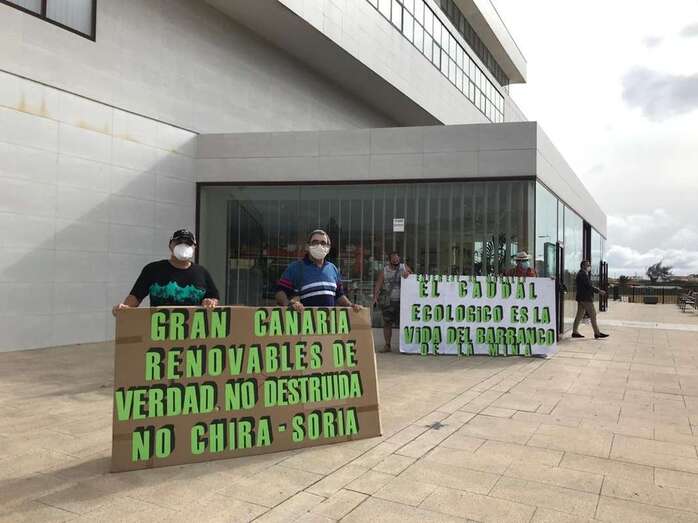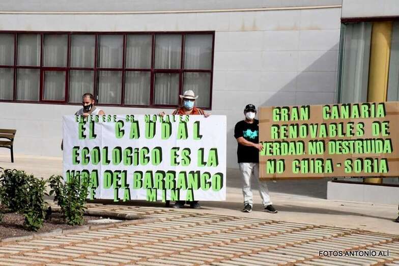 Los activistas, entre los que se encontraba el teldense Honorio Galindo, presidente de Turcón Ecologistas en Acción (uno de los colectivos que integran la plataforma), desplegaron dos pancartas al inicio de la visita. Gran Canaria, renovables de verdad. No destruída. No Chira - Soria rezaba una de ellas, mientras que en la otra se podía leer Entérese señor Morales, el caudal ecológico es la vida del barranco de La Mina.