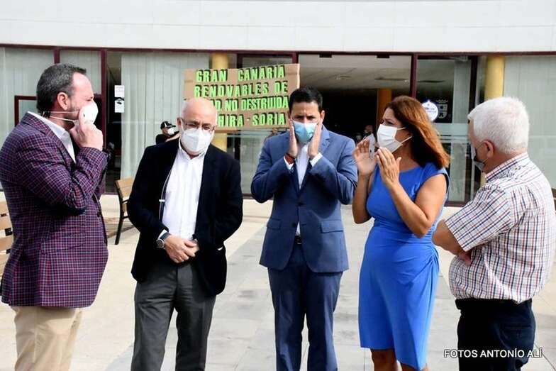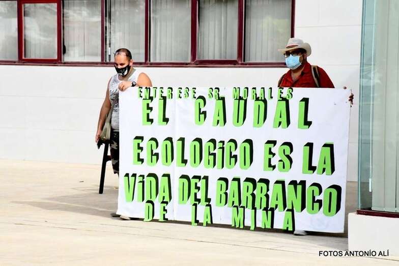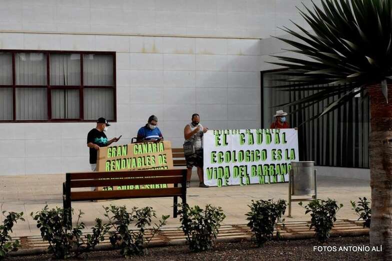 Telde.- Cuatro miembros de la plataforma Salvar Chira-Soria aprovecharon la visita este jueves a Telde del presidente del Cabildo de Gran Canaria, Antonio Morales, para visibilizar su rechazo al proyecto de la central hidroeléctrica de bombeo de agua entre las presas de Chira y Soria y para exigir que se restaure el caudal del barranco de La Mina.