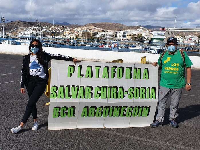 La plataforma que lucha contra la obra hidráulica con la que se pretende construir en el Barranco de Arguineguín ha querido estar hoy presente en Arguineguín, ante las autoridades europeas y nacionales para hacerles llegar que “la solidaridad de la Plataforma Salvar Chira-Soria con las personas que arriban a nuestras costas en busca de una vida mejor”.