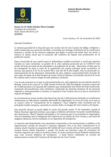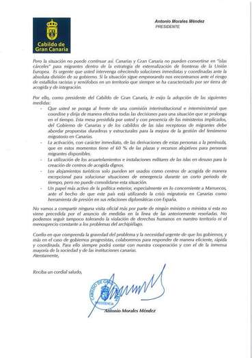La extrema gravedad de la situación que vive nuestra isla de Gran Canaria me obliga a dirigirme a usted reclamando una actuación decidida e inmediata que detenga el deterioro de las condiciones humanas y sociales de las personas migrantes que llegan a nuestra isla desde hace seis meses y reduzca la alarma social que la actuación del Gobierno de España está produciendo en la población canaria.