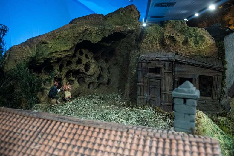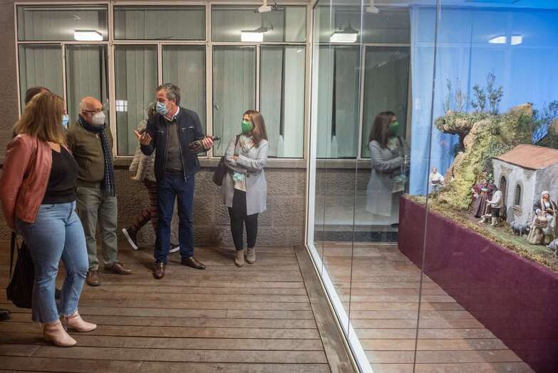 Tras la eclosión de la vida que encarna el recién nacido, el Belén tiene como broche una escena de cuidados en la que una mujer vierte agua delicadamente con una jofaina sobre la cabeza de un hombre mayor y enfermo.