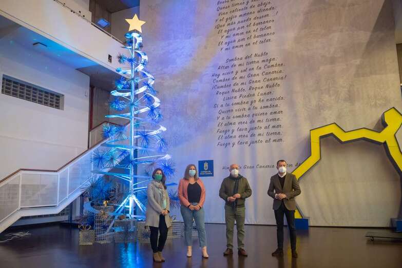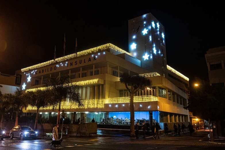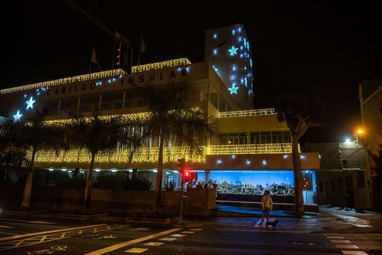 El decorado navideño de la sede del Cabildo lo completan el árbol del patio, en esta ocasión una ligera estructura metálica que sustituye al pino de entresaca de años anteriores, y la iluminación que enmarca el edificio con 500 metros de cortinillas de 90.000 bombillas micro led que parpadean en las cornisas y dibujan estrellas sobre su torre para arrojar claridad sobre las postrimerías de 2020 y los albores del 2021.