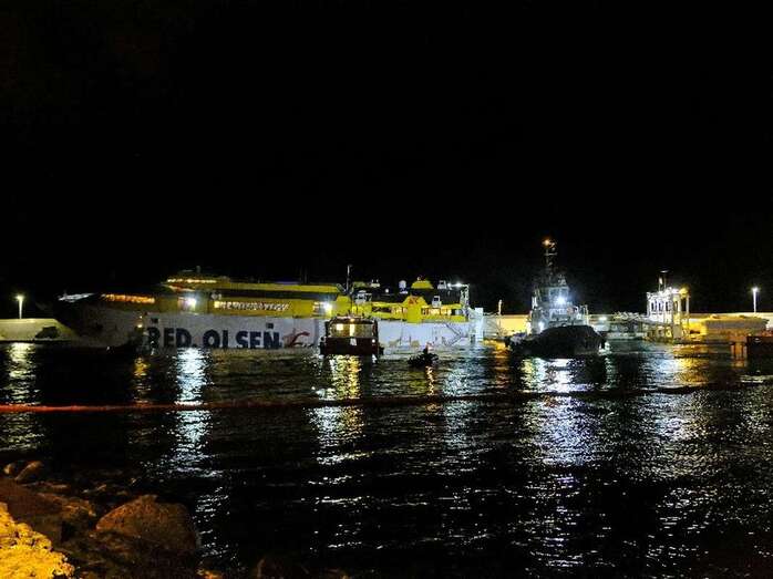 Los equipos contratados por Fred Olsen Express para rescatar el barco han trabajado en las últimas horas en devolver la flotabilidad a su patín izquierdo y han logrado liberar al ferry aprovechando la última pleamar, que tuvo lugar en torno a la medianoche.