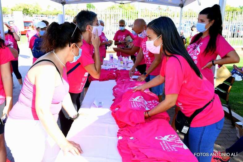 En los previos a la salida de la caminata los cientos de asistentes pudieron adquirir camisetas rosas de apoyo a la Asociación de Cáncer de Mama.