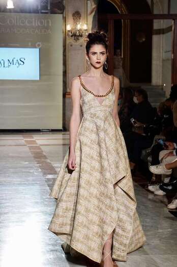 Palmas ha desplegado para ello tejidos que van desde los mikados de seda, a los algodones calados, los creps georgettes, los tules bordados, las alpacas o los pailletes. Además, ha combinado cortes clásicos renovados, con transparencias sutiles y formas y patrones estructurados logrando una colección de elegancia sencilla y sublime.