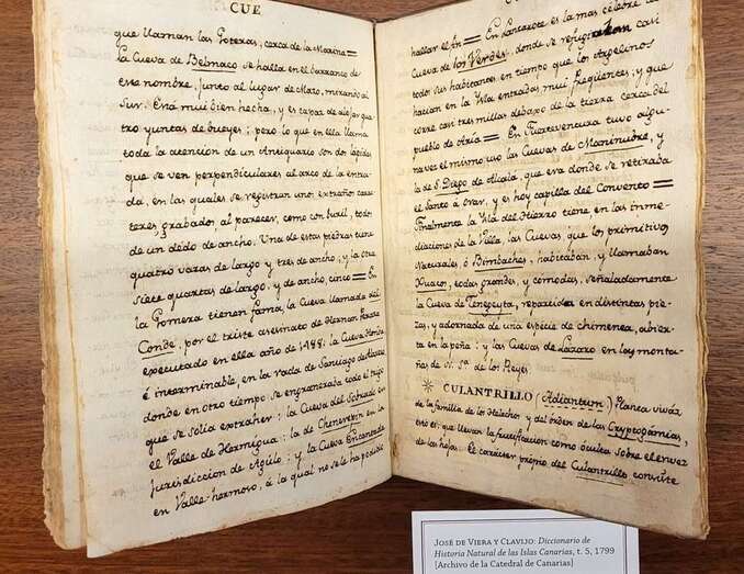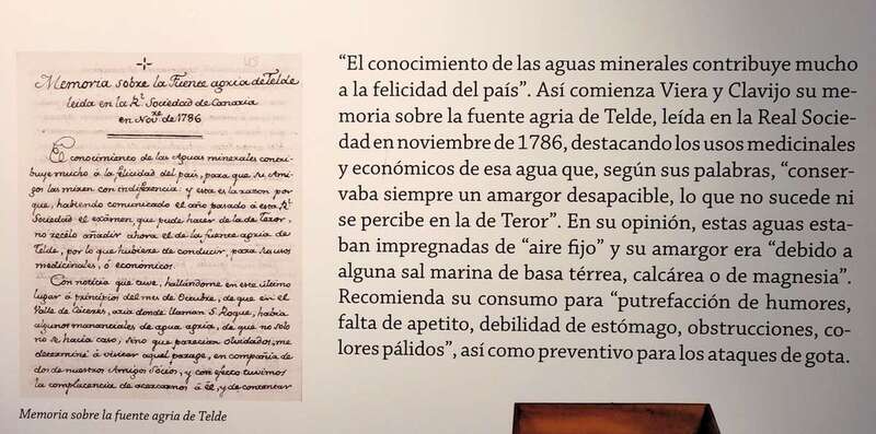 Destaca en el panel titulado Las aguas agrias de Telde un manuscrito de Viera y Clavijo en el que describe según sus observaciones y análisis químicos la naturaleza y propiedades de estas aguas: “El conocimiento de las aguas minerales contribuyen mucho a la felicidad del país”.