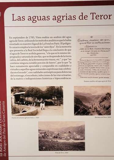En su opinión, estas aguas estaban impregnadas de “aire fijo” y su amargor era “debido a alguna sal marina de base térrea, calcárea o de magnesia”. Recomienda su consumo para “putrefacción de humores, falta de apetito, debilidad de estómago, obstrucciones, colores pálidos”, así como preventivo para los ataques de gota. En dicho panel figura una antigua panorámica de la Vega de Telde, 1893. La caja portátil con frascos de productos químicos para análisis científicos, propiedad de Viera y Clavijo. Una imagen del puente de Telde y copia del manuscrito de la Memoria de la Fuente agria de Telde.