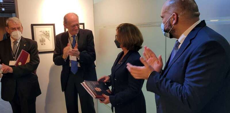 El director de la Real Sociedad Económica de Amigos del País de Gran Canaria, como anfitrión y presidente del Comité Organizador, don Tomás Van de Walle Sotomayor, hace entrega a doña Encarna Galván del libro José de Viera y Clavijo en la Real Sociedad Económica de Amigos del País de Gran Canaria.