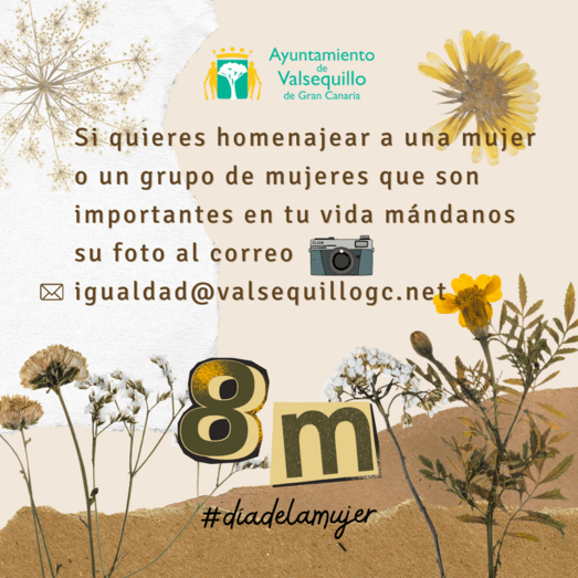 Por ello, se deben enviar las fotografías de mujeres (individual, acompañada, en familia o en grupo), siempre con el consentimiento previo de las protagonistas, a las que se quieran homenajear. Unas imágenes que ya pueden remitir al correo igualdad@valsequillogc.net con el nombre, apellido y la dedicatoria a esa o esas mujeres especiales.
