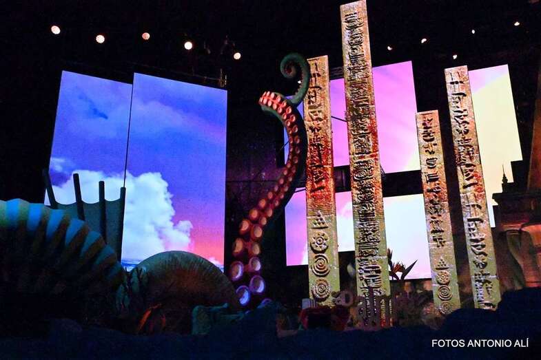Una barra, mesas y taburetes estrenaban el escenario diseñado por Sergio Macías. Sobre el mismo, cinco escenas hacían retroceder a todos los espectadores en el tiempo. A los mogollones, al parque blanco, a los chiringuitos de estudiantes, a la discoteca Mogambo, a las noches de murgas…Un sinfín de vivencias del pasado para rememorar a todos los personajes y grupos del Carnaval, a los músicos y letristas que dejaron himnos como el de Tomás Pérez y Sindro Saavedra, a diseñadores, maquilladores, reinas, drags y a toda la familia que conforma el Carnaval. Estampas en la memoria que reflejan “el buen rollo, el bailoteo, el vacilón, la diversión y la buena gente” de aquellas noches de los años 80 y 90.
