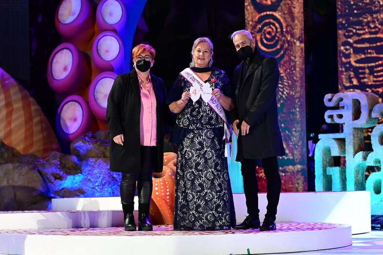 1. DISTRITO CENTRO presenta a María Rosa García Bolaños con la fantasía ‘Reina al fin, en mi plena juventud’ con un diseño de Kevin Rodríguez González y Enrique González Martín.
