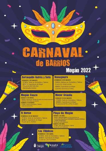 En el casco de Mogán los talleres de Carnaval e hinchables serán las 17:30 horas en la cancha municipal. Ya el sábado 19 de marzo estos se trasladan a la plaza de Motor Grande a las 17:30 horas y a las 20:00 horas el espectáculo de magia. Estas mismas actividades y horario se desarrollarán en la plaza de El Horno el 20 de marzo.
