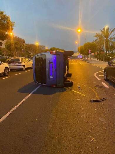 La Policía Local de la capital grancanaria informa de un accidente de circulación con un vuelco y tres vehículos implicados en la Avenida Pintor Felo Monzón, en Las Palmas de Gran Canaria.