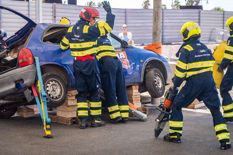 Un vehículo atravesado por una valla quitamiedos desde el suelo al techo ocupado por un hombre en estado crítico y amputación de una mano fue la maniobra corta calcada de un caso real con la que los Bomberos de Gran Canaria cerraron hoy su intervención en el Encuentro Nacional de Rescate en Accidentes de Tráfico, que tiene un formato "atractivo ideado para aprender a salvar vidas", tal como indicó Roger Ginars, miembro de la organización.