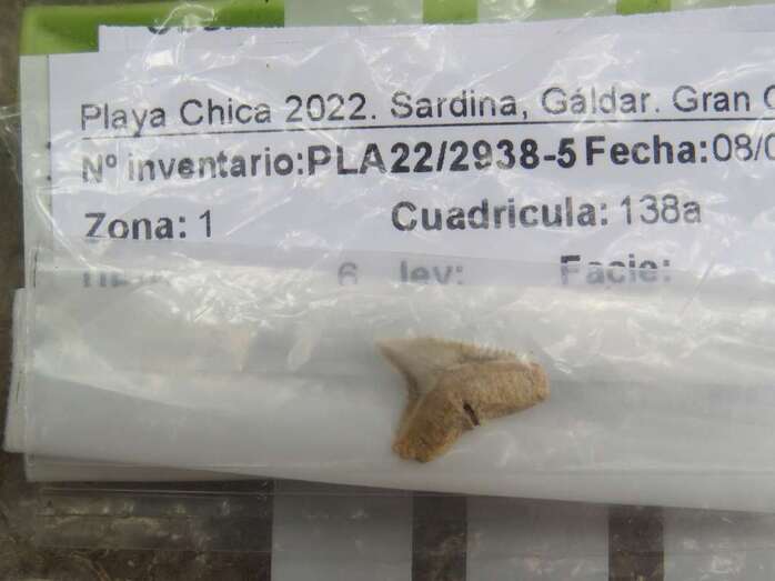 Entre los hallazgos más singulares en esta Cueva de Playa Chica hay que destacar un diente de tiburón, al que no se ha podido asignar una especie concreta, pero que constituye un elemento sin demasiados antecedentes en el registro arqueológico canario.