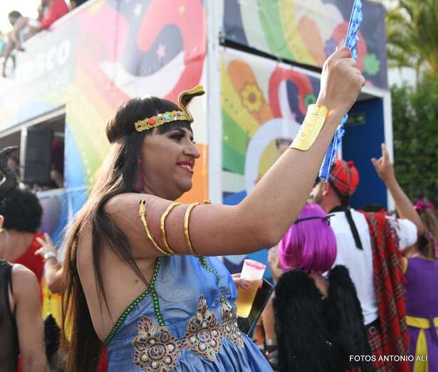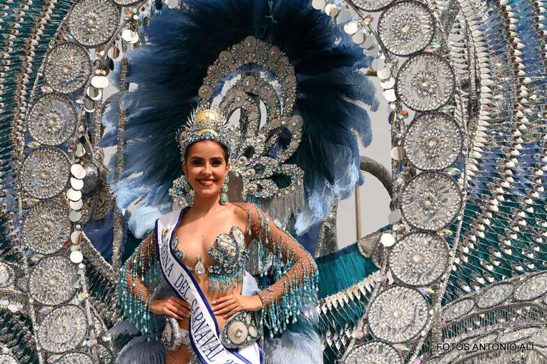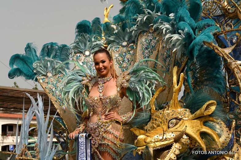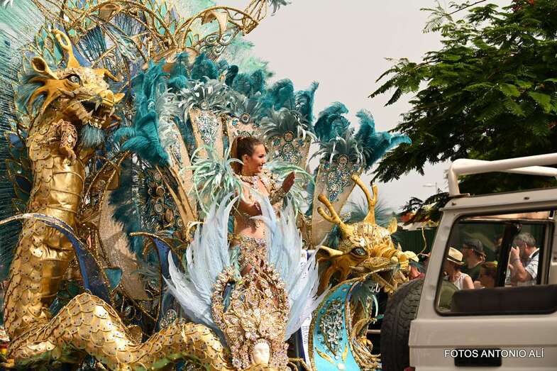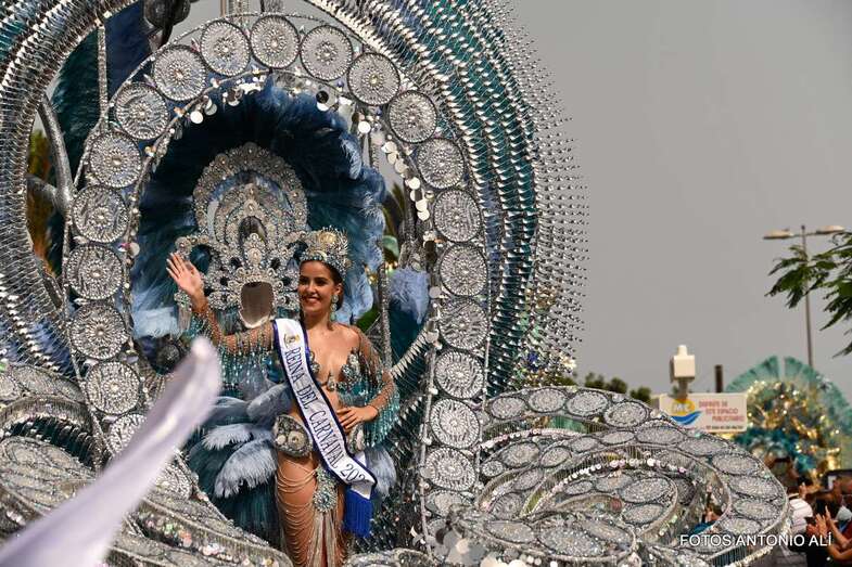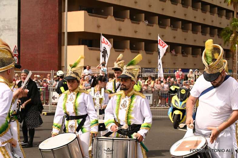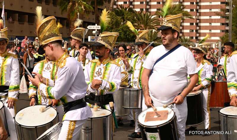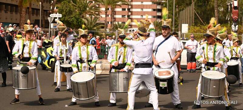 Con puntualidad casi británica, algo después de las cinco, la comitiva se abrió paso por las calles de Playa del Inglés a ritmo de una vibrante batucada, la de Percumaná. Tras ella, en fila casi protocolaria, los remolques con las reinas y drags de esta edición del carnaval dedicado a La Magia.