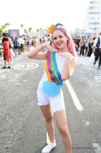 A Serafín Guedes le vino bien su fantasía 'La niña del paraguas'. Aunque el traje que lucía no era precisamente un bañador, al menos la excusa del paraguas le vino bien para usarlo como sombrilla y le ayudó a soportar las primeras horas, bajo un sol de justicia, de la gran cabalgata del Carnaval Internacional de Maspalomas.