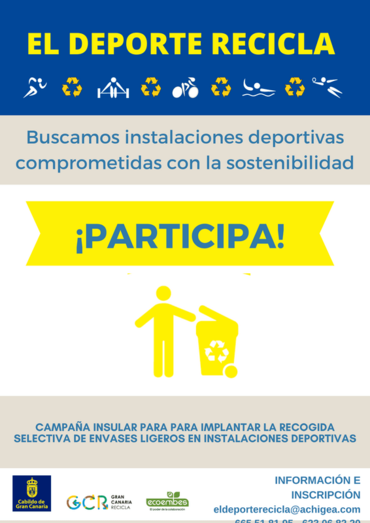 El Servicio de Residuos de la Consejería de Medio Ambiente del Cabildo de Gran Canaria, en colaboración con Ecoembes, ha puesto en marcha la Campaña El Deporte Recicla, una iniciativa de seis meses de duración cuyo objetivo es facilitar los recursos y apoyos necesarios para que las instalaciones deportivas implanten buenas prácticas ambientales, de cara a reducir la generación de envases ligeros (plásticos, latas y briks) y, en su caso, la separación y recogida selectiva de los mismos.