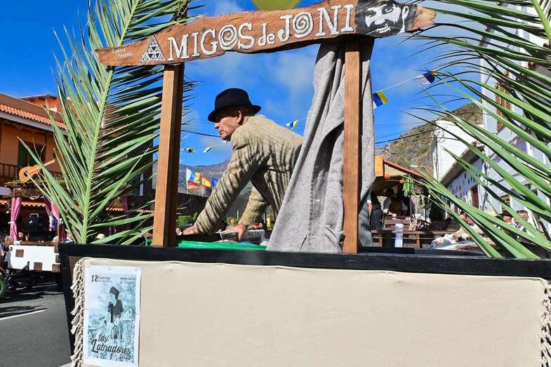 “Los amigos de Joni” es el nombre de la primera carreta. Joni López Duarte se fue demasiado pronto, con apenas 45 años en septiembre de 2018, al luto se sumó la pandemia, pero este año amigos y familiares quisieron que el antiguo notificador municipal e investigador de nuestras tradiciones estuviera presente. Un hermano de Joni, Esteban López, atiende desde la carreta las peticiones de comida y bebidas de parranderos y acompañantes. Hay chicharrones, hay queso, hay papas arrugadas, hay mejunje, hay aceitunas, hay de todo menos prisa, por eso un recorrido de poco más de un kilómetro se tarda varias horas en hacer, en Los Labradores hay que vivir cada minuto con intensidad.