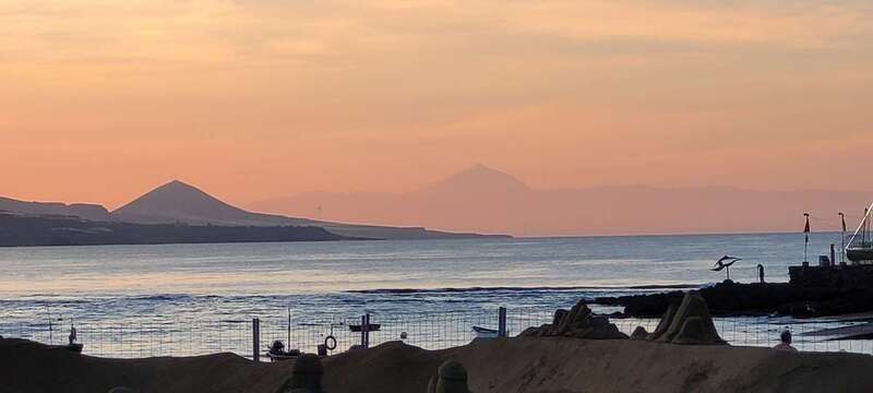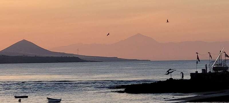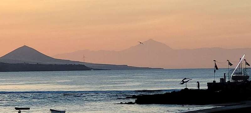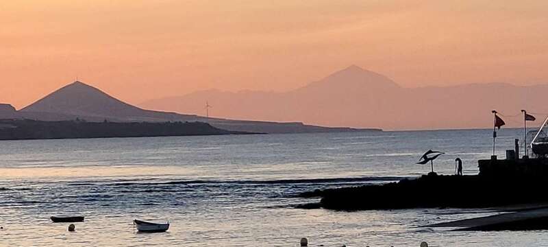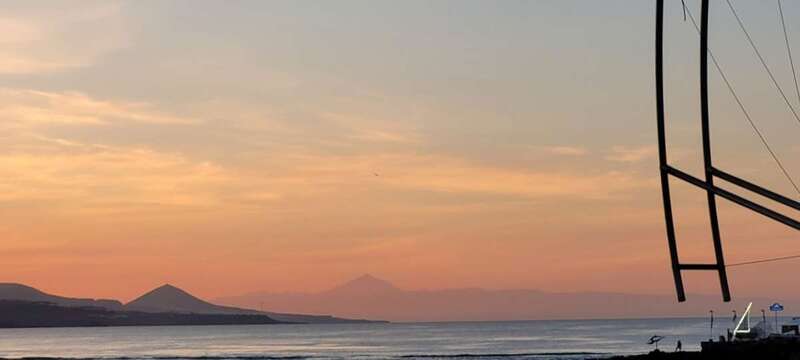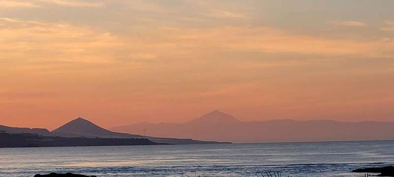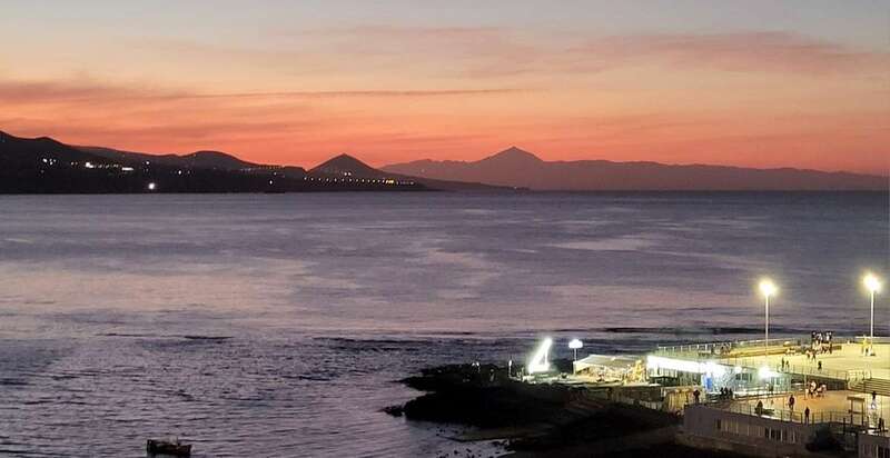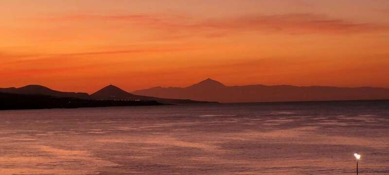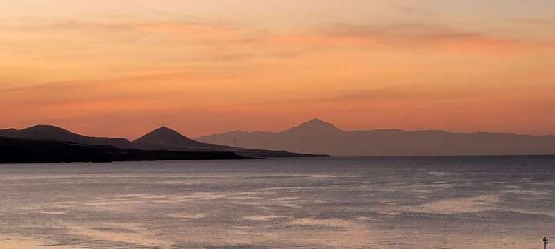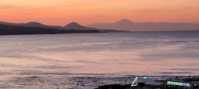 Asomados al paisaje de uno de los espectaculares ocasos arrebolados de nuestro bello litoral insular, uno de los más impresionantes de este rincón del Atlántico, el de la playa urbana capitalina de Las Canteras y su entorno. La mirada a la caída de la tarde sobre la gran bahía, playa y cumbres grancanarias, dos pirámides volcánicas se alzan a los cielos, tras vislumbrar en primer plano la formación de la Montaña de Ajodar, atalaya de los municipios norteños de Guía y Gáldar, y como el espectro de su propia sombra nos aparece el gran Teide, elevando su grandeza sobre los perfiles de la isla hermana de Tenerife.
