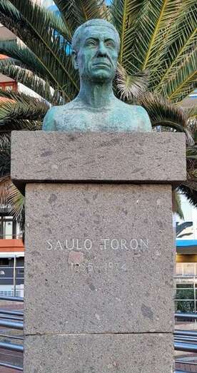 Y no lejos, a unos metros y en ocasiones desde este mismo emplazamiento he saludado la presencia y memoria del poeta Saulo Torón (Telde, Gran Canaria, 1885 – Las Palmas de Gran Canaria, 1974) que con Tomás Morales y Alonso Quesada, forman, entre otros destacados escritores, la intelectualidad literaria modernista de nuestro mundo atlántico insular del siglo XX. A la sombra del escultórico busto de Saulo Torón obra del artista Juan Jaén, ubicado sobre el pétreo pedestal en la plaza que honra al poeta, de este capitalino paseo de Las Canteras, cerca de donde viviera años de su vida, y por trabajo en torno al Puerto de La Luz, su mirada fija, profunda, eterna sobre el horizonte de mar y tierra nos lleva a recordar y recitar, entre su diversa obra literaria, los versos dedicados desde su más profundo sentimiento y amor, que por su mar siente, de la serie poética del poemario El caracol encantado (1926), dedicado a Tomás Morales, en Tristezas y oraciones del crepúsculo, escribe: