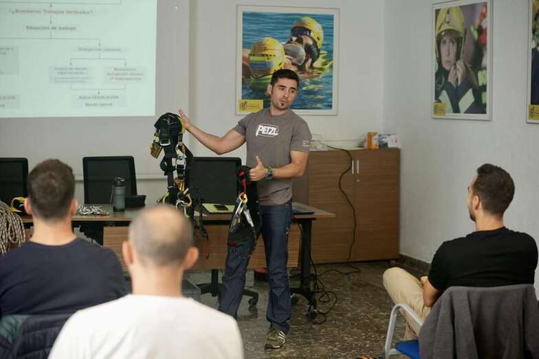 El bombero César Martínez explicó que las técnicas deportivas inspiraron hace décadas los inicios de la atención de emergencias en alturas hasta que la legislación laboral comunitaria y estatal diferenciaron claramente el ámbito deportivo y el profesional con sustanciales diferencias como que la seguridad y la formación en el mundo deportivo es voluntaria y en el profesional obligatoria, de una cuerda se pasa a dos, la de trabajo y la de seguridad, y del criterio de ligereza y comodidad de los equipos se pasa a priorizar la seguridad, con la comodidad como criterio secundario.